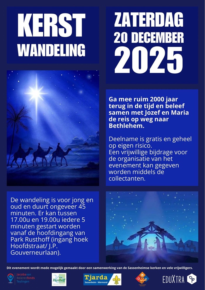 Niet iedereen kan tegelijk naar binnen, dus kies zelf het meest geschikte moment tussen 17.00 en 19.00 uur op zaterdagmiddag/avond om de wandeling te starten. Deze kerstwandeling wordt georganiseerd door de gezamenlijke kerken van Sassenheim in samenwerking met onder andere de evenementencommissie van park Rusthoff en waterscouting Tjarda en vele vrijwilligers van verschillende verenigingen.