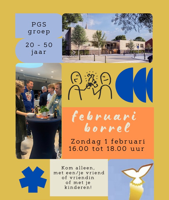 Op zondag 1 februari om 16.00 uur komen we weer bij elkaar voor een gezellige samenkomst. Iedereen tussen de 20 en 50 jaar (of net daaronder of net daarboven) is welkom in het Venster voor een borrel. Kom alleen of neem iemand of je gezin mee. Met elkaar maken we een mooie start aan het begin van het nieuwe jaar!