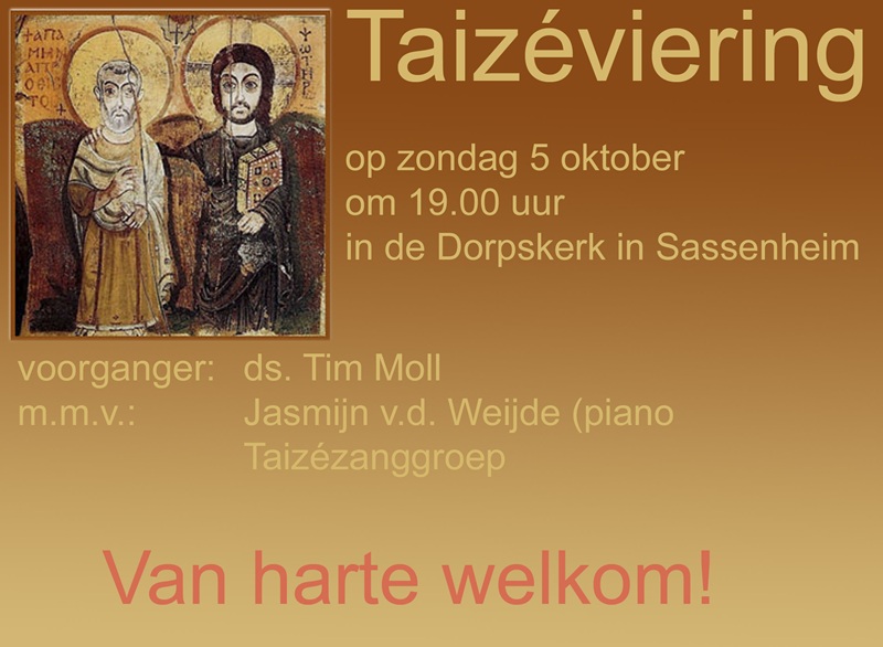 Op zondag 5 oktober is er weer een oecumenische Taizéviering. Voorganger is ds. T. Moll en een zanggroep zal haar medewerking verlenen om de samenzang extra te ondersteunen. Rondom de stilte zal Jasmijn van der Weijde piano spelen.